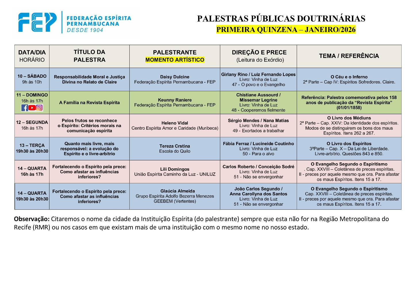 A direção da Federação Espírita Pernambucana (FEP) sugere que as instituições espíritas atentem para as orientações dos organismos de saúde e continuem seguindo as recomendações que em nosso Estado foram estabelecidas.