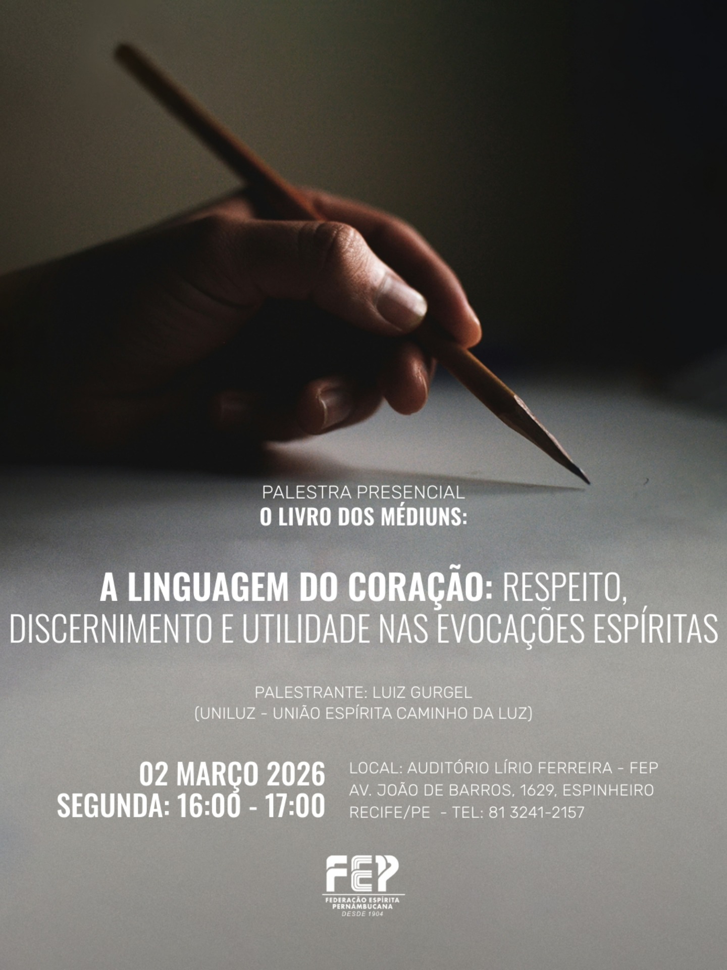O tema “Estudo sobre as comunicações de um espírito sofredor” será apresentado por Dayse Queiroz, da União Espírita Caminho da Luz (UNILUZ).