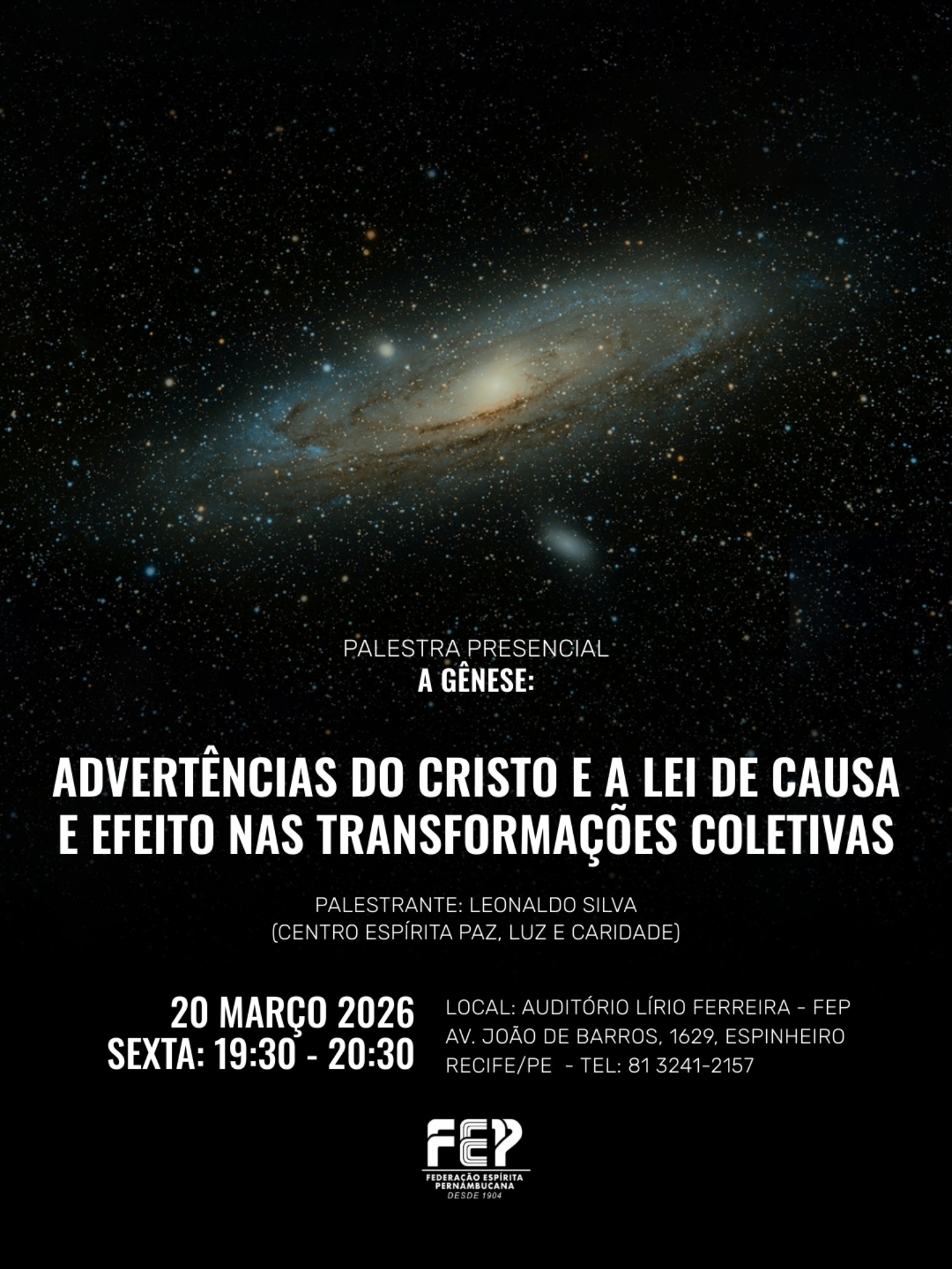 Neste sábado, dia 13 de abril, das 9h às 10h, a FEP promove palestra presencial em seu Auditório Lírio Ferreira.