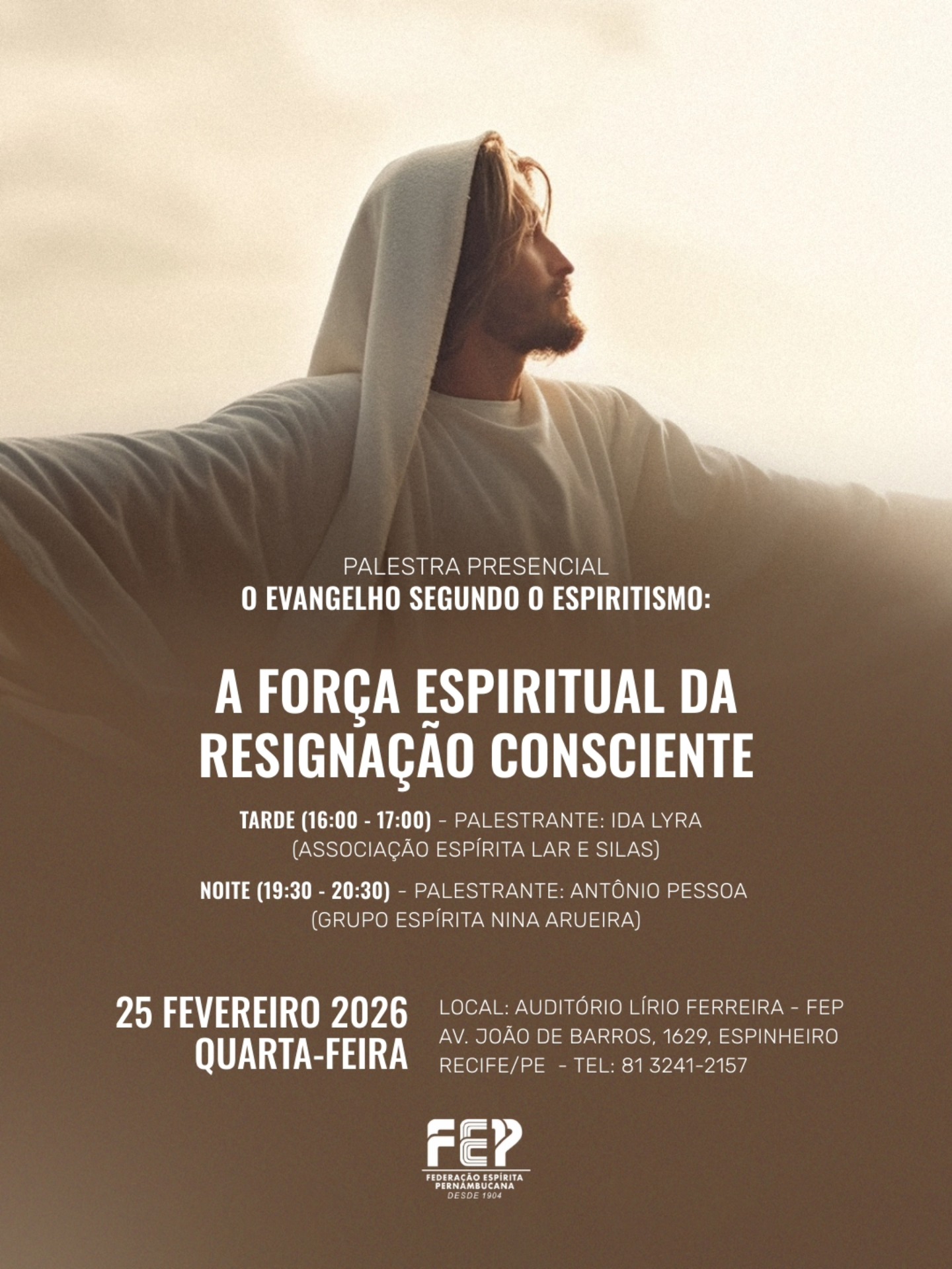 Nesta sexta-feira, dia 25 de outubro, das 19h30 às 20h30, a FEP promove palestra pública presencial, em seu auditório Lírio Ferreira.