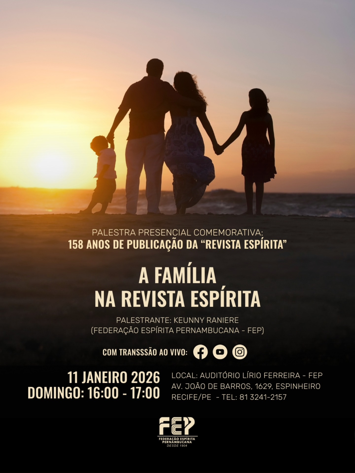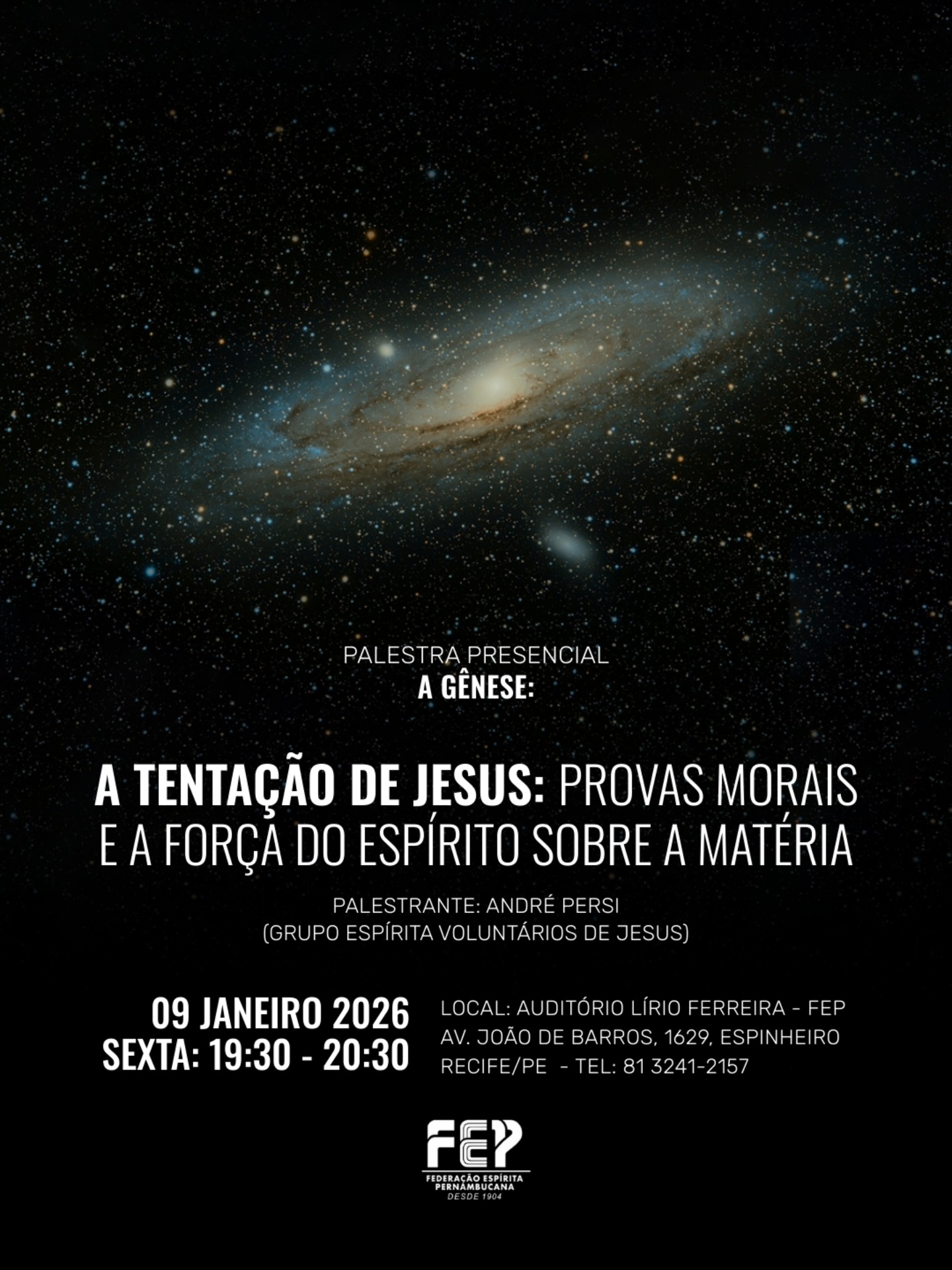 Nesta sexta-feira, dia 20 de dezembro, das 19h30 às 20h30, a FEP promove palestra pública presencial, em seu auditório Lírio Ferreira.