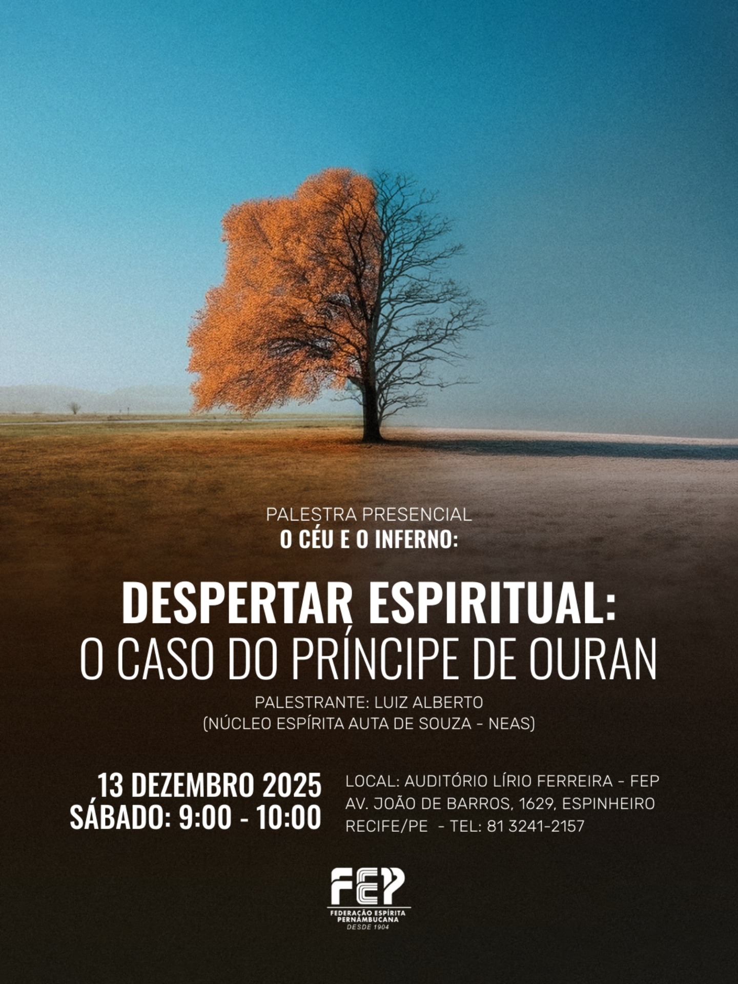 O tema “Bicorporeidade e transfiguração: Fenômenos do Espírito na jornada terrena” será apresentado por Fábio Mota, diretor do Departamento Financeiro (DEFIN) da FEP.