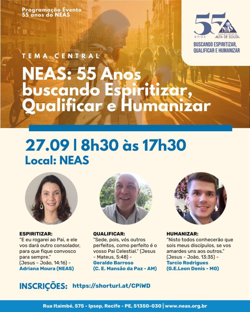 Assim, com muita alegria, convidamos a todos para participar deste seminário que trabalhará o tema central “NEAS: 55 anos buscando Espiritizar, Qualificar e Humanizar” ao longo de todo o dia (8h30 às 17h30).