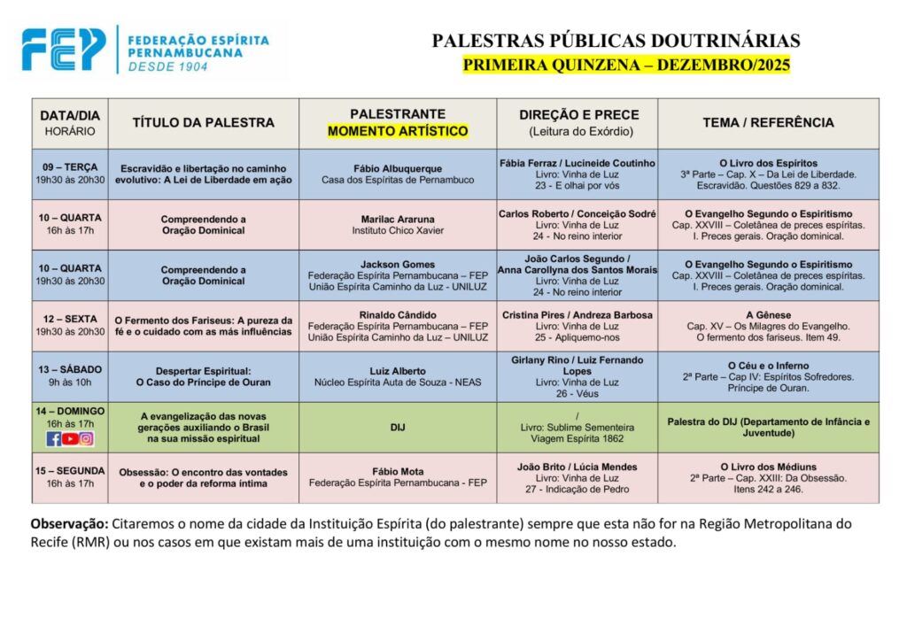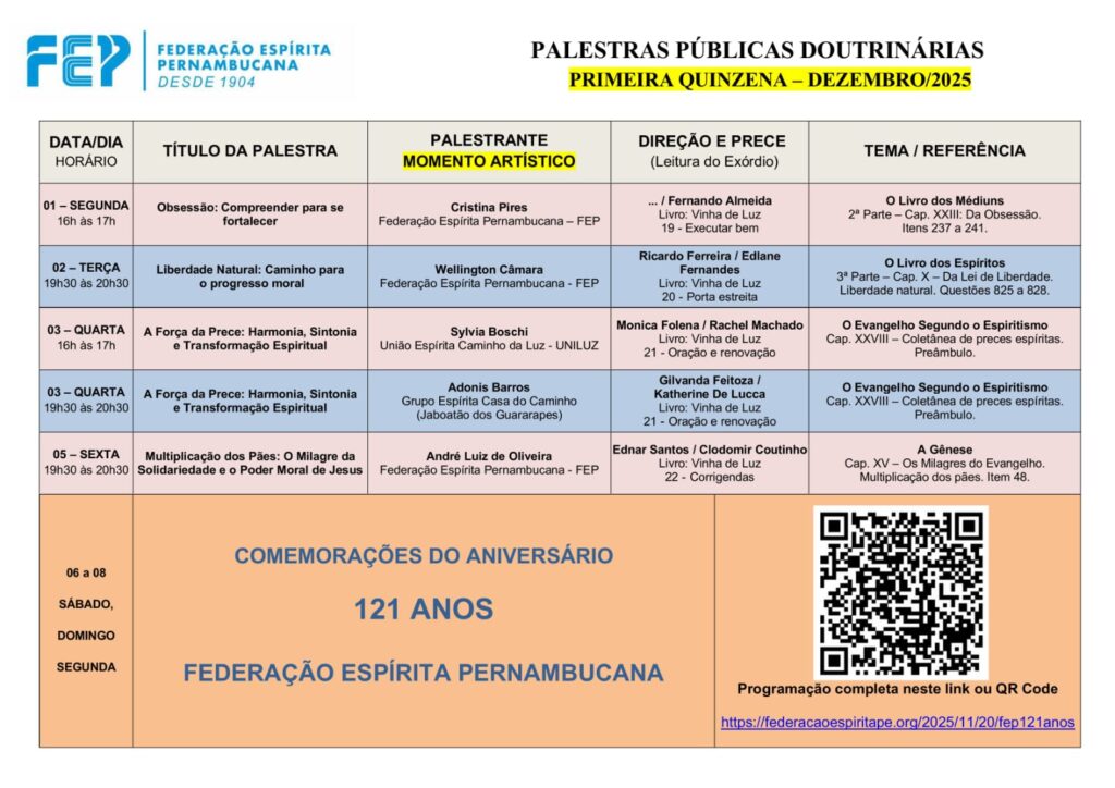 Agenda de palestras FEP – 1º Quinzena – dezembro/2025