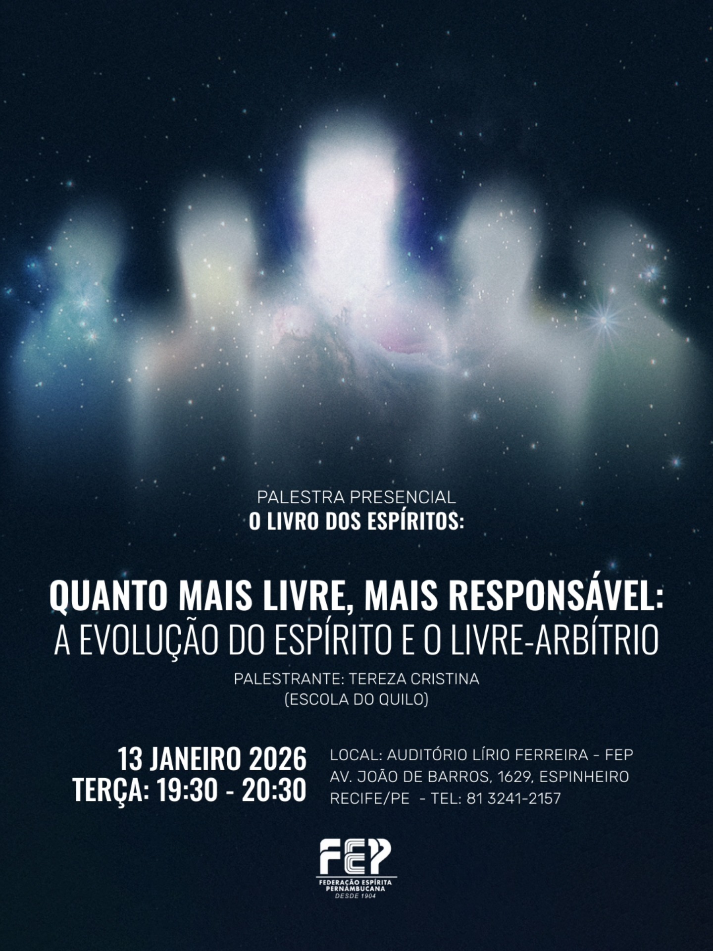 Nesta terça-feira, dia 13 de janeiro, das 19h30 às 20h30, a FEP promove palestra pública doutrinária em seu Auditório Lírio Ferreira.