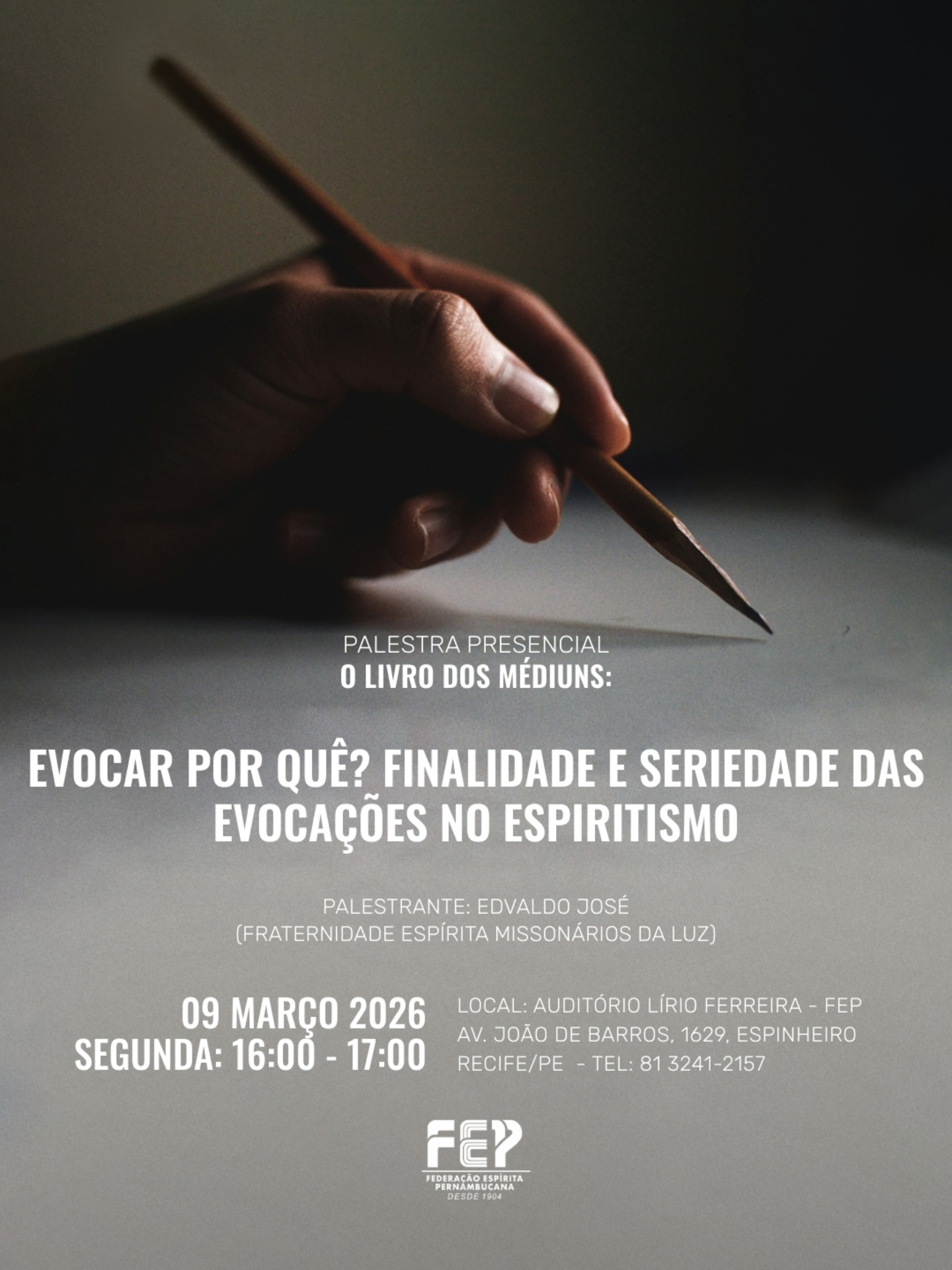 O tema “Evocar por quê? Finalidade e seriedade das evocações no Espiritismo” será apresentado por Edvaldo José, da Fraternidade Espírita Missionários da Luz.