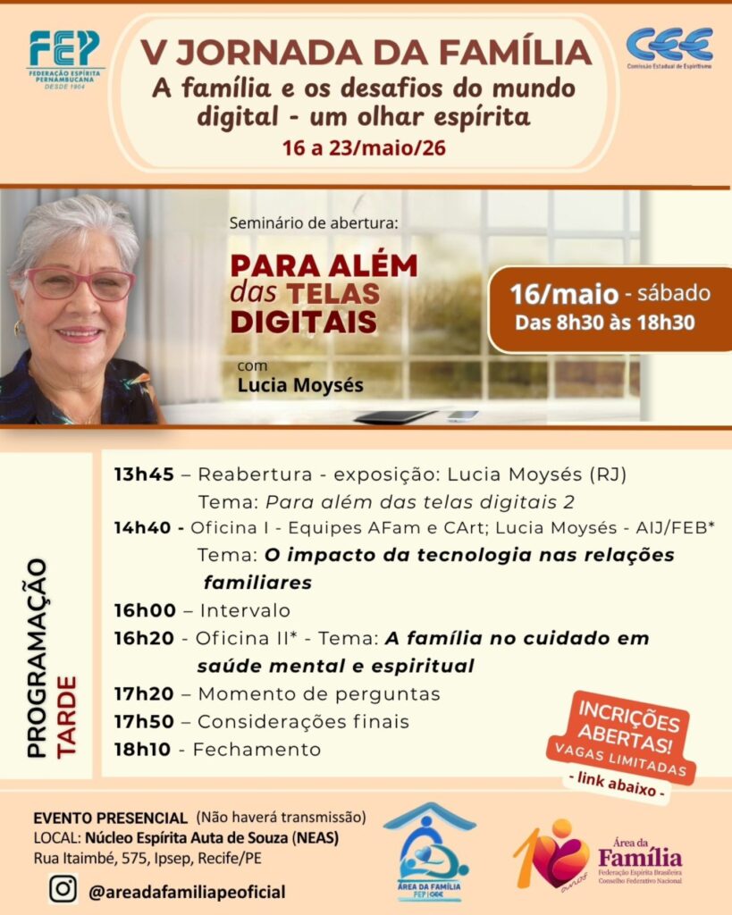 Dias 16 e 17, por exemplo, será realizado o Seminário da V Jornada da Família, que abordará o tema “Para além das telas digitais”.