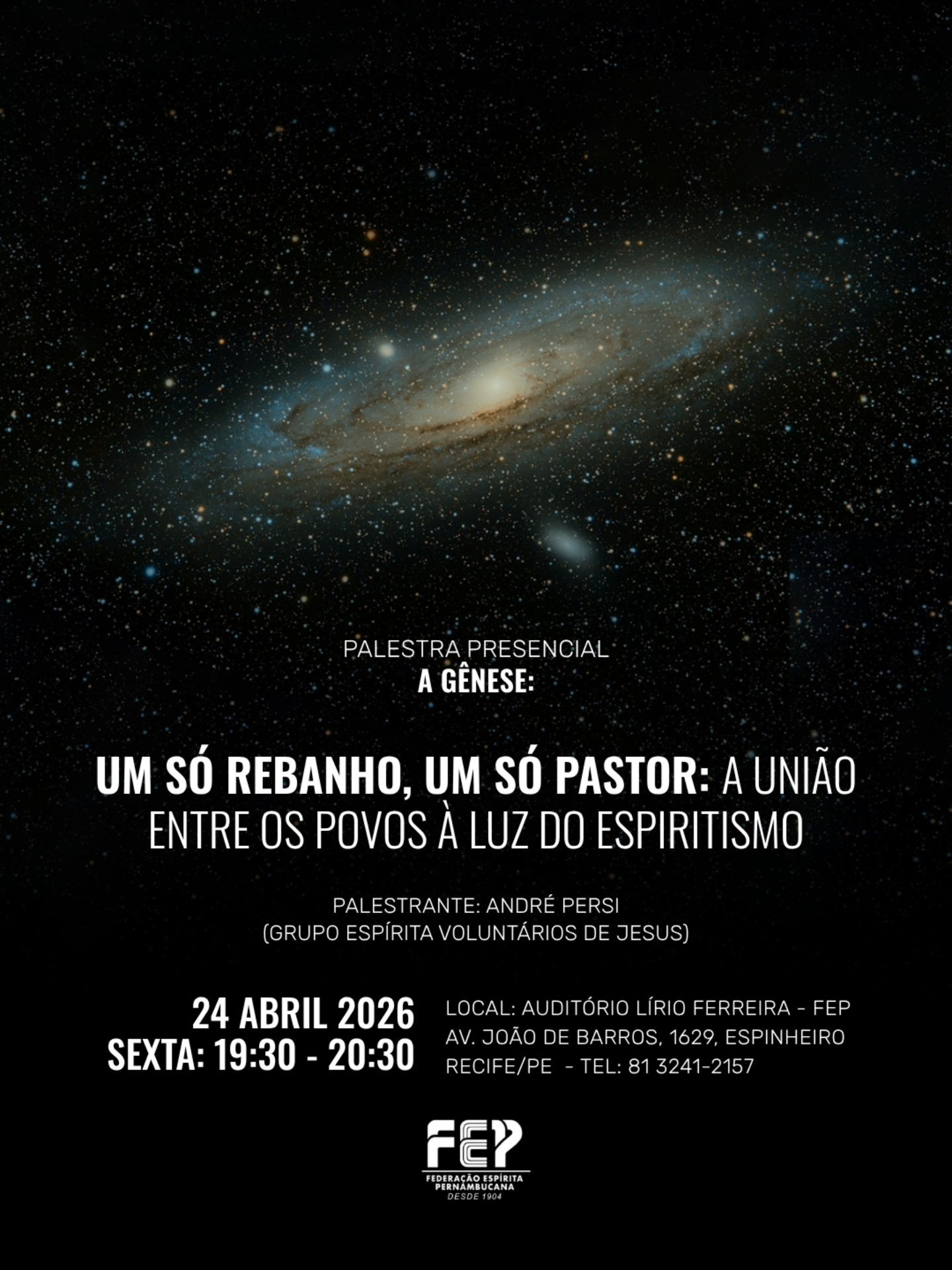 🙂Neste sábado, dia 25 de abril, das 9h às 10h, a FEP promove palestra pública doutrinária em seu Auditório Lírio Ferreira.